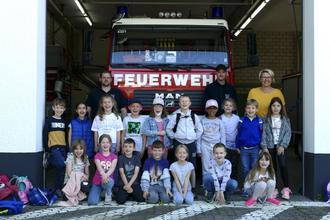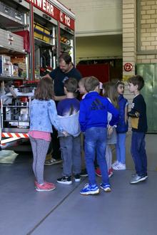 Der Besuch bei der Feuerwehr, das ist Aufregung pur. Die 1. Klassen der Grundschule besuchen sie im Rahmen ihrer Wanderwoche. Markus Schweitzer und Thomas Knape haben sich dafür extra freigenommen. Das macht immer Spaß mit den Kindern, sind sie sich einig. Zu Beginn gibt es eine Einweisung. Die Notfallnummer wird erklärt. Danach lernen die Kinder die 5 W-Fragen Wo ist es passiert? Wer setzt den Notruf ab? Was ist genau passiert? Wie viele Verletzte gibt es? Warten! Auch die Schutzkleidung wird gezeigt. Spannend war vor allem der Gürtel mit der Axt. Da kommt man überall mit rein, erklärt Maxi. Er ist bei der Minifeuerwehr und kennt sich aus. Seine Freunde sind beeindruckt.
