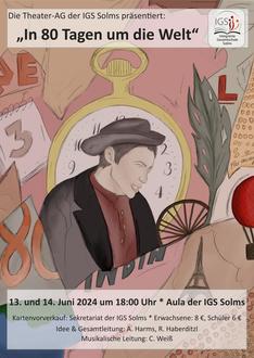 Die Theater-AG der Integrierten Gesamtschule Solms lädt herzlich zu ihrem jährlichen Theaterstück ein! Dieses Jahr entführt uns das Ensemble „In 80 Tagen um die Welt“. Erleben Sie in Jules Vernes "In 80 Tagen um die Welt" die Abenteuer von Phileas Fogg und seinem Diener Passepartout. Verfolgen Sie ihre rasante Reise um den Globus, bei der sie zahlreiche Hindernisse überwinden und eine Wette gewinnen müssen.