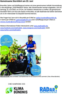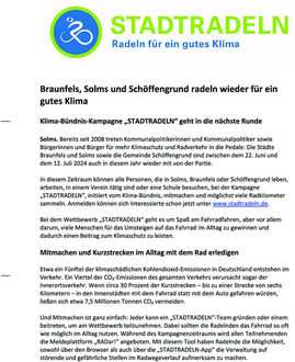 Solms. Bereits seit 2008 treten Kommunalpolitikerinnen und Kommunalpolitiker sowie Bürgerinnen und Bürger für mehr Klimaschutz und Radverkehr in die Pedale: Die Städte Braunfels und Solms sowie die Gemeinde Schöffengrund sind zwischen dem 22. Juni und dem 12. Juli 2024 auch in diesem Jahr wieder mit von der Partie.