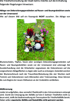 Leider ist aufgefallen, dass vermehrt Plastikmüll in den Grüncontainern entsorgt wird. Damit die Entsorgung der Abfälle auf den 5 Solmser Friedhöfen nicht zu teuer wird, stellt die Stadtverwaltung ein Trennsystem für Friedhofabfälle bereit. Dabei sollen organische Abfälle und Restabfälle strikt getrennt werden.