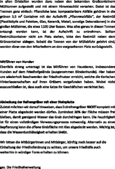 Wir bitten die Mitbürgerinnen und Mitbürger, künftig noch besser auf die Einhaltung der Friedhofordnung zu achten, um unsere Friedhöfe auch weiterhin in würdiger Form erhalten zu können.