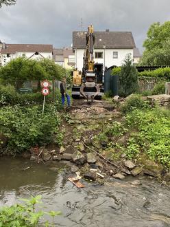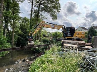 Letzte Woche wurde nun die Brücke innerhalb von zwei Tagen durch die Firma Fredy Wagner aus Schöffengrund abgerissen. Dabei bestätigte sich die schlechte Substanz des Bauwerks, da die Stahlträger bereits sehr stark von Korrosion behaftet waren. Die Lieferung und der Einbau der neuen Brücke soll planmäßig Anfang August durch die Firma BGL Ingenieurbau erfolgen und bis Mitte August abgeschlossen sein.
