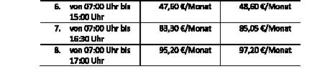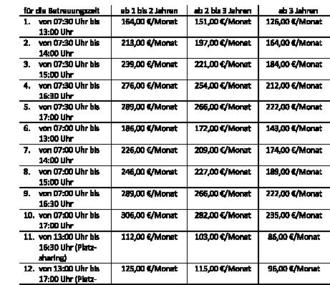 | i. V. m. Abs. 5 erhoben. Ein weiteres Kind ist für die Betreuungszeit von 07:30 Uhr bis 13:00 Uhr und für die Teilnahme am Platzsharing befreit. Für alle anderen Betreuungszeiten fallen folgende Betreuungsgebühren an: |