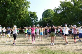 Spaß an Bewegung - dafür sorgte auch der gemeinsame Aufwärmtanz zu lauter Musik am Anfang. Aufgrund der Hitze begannen die Bundesjugendspiele mit einem Cross- Lauf, der mit einigen Schwierigkeiten, wie steilen Anstiegen und Treppenlaufen gestaltet war. Hierfür wurden die Kinder nach Jahrgängen eingeteilt.