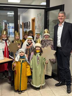 Bürgermeister Inderthal empfing die als Heilige Drei Könige verkleideten Kinder im Rathaus. Gemeinsam sangen sie Lieder und brachten den Segensspruch „20C+M+B25“ (Christus Mansionem Benedicat - Christus segne dieses Haus) an der Rathaustür an. Die diesjährige Aktion steht unter dem Motto „Erhebt eure Stimme! Sternsingen für Kinderrechte“ und lenkt den Fokus auf die Rechte von Kindern weltweit.