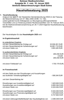 Der Haushaltsplan liegt vom 16. Januar 2025 bis einschließlich 31. Januar 2025 in der Stadtverwaltung Solms, Oberndorfer Str. 20, während der gültigen Öffnungszeiten zur Einsichtnahme öffentlich aus:
