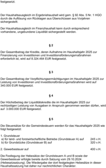 Die Festlegung der Hebesätze der Grundsteuern A und B sowie der Gewerbesteuer erfolgte bereits durch Satzung vom 29.10.2024 (Hebesatzsatzung). Die Wiedergabe der dort festgelegten Hebesätze in dieser Haushaltssatzung hat daher nur nachrichtlichen Charakter.