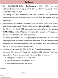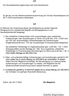 | 1.) | Der erhebliche Umfang bisher nicht veranschlagter oder zusätzlicher Aufwendungen oder Auszahlungen im Sinne von § 98 Abs. 2 Nr. 3 HGO wird auf 10% des veranschlagten Gesamtbetrages der Aufwendungen (Ergebnishaushalt) bzw. 15% der Auszahlungen (Finanzhaushalt) festgesetzt. |
