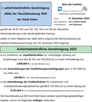 Die vorstehende Haushaltssatzung für das Haushaltsjahr 2025 der Stadt Solms wird hiermit öffentlich bekannt gemacht. Die erforderliche Genehmigung der Aufsichtsbehörde wurde mit Schreiben vom 12. Dezember 2024 des Landrates des Lahn-Dill-Kreises erteilt und hat folgenden Wortlaut: