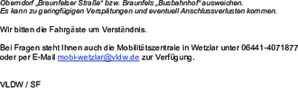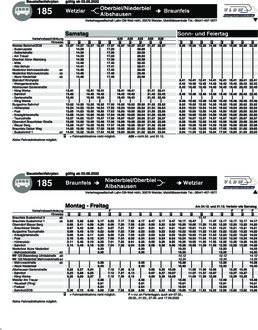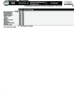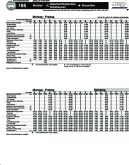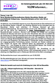 Ab Mittwoch, den 03.08.2022 beginnt ein neuer Bauabschnitt der Baumaßnahme auf der Braunfelser Straße in Wetzlar. Aus Richtung Steindorf ist die Innenstadt über die Braunfelser Straße nicht anfahrbar; in Richtung Steindorf gilt eine Einbahnstraßenregelung. Der Linienverkehr auf der Linie 185 (Wetzlar - Braunfels) wird für die Dauer der Maßnahme in beide Fahrtrichtungen nach einem Baustellenfahrplan verkehren. Steindorf wird montags bis freitags und samstags während der Bauzeit nicht mehr von der Linie 185 bedient. Die Linie 10 verkehrt für die Anbindung von Steindorf ebenfalls nach einem Baustellenfahrplan. Sonntags wird Steindorf innerhalb des Baustellenfahrplans der Linie 185 angefahren. Die Linie 185 nimmt von Wetzlar Bahnhof/ZOB den Fahrweg direkt über die B49 nach Albshausen und dann nach Burgsolms. Die Haltestellen in Albshausen werden entsprechend in der entgegengesetzten Fahrtrichtung bedient. Innerhalb von Wetzlar entfallen bei allen Fahrten die regulär über Steindorf führen die Haltestellen im Stadtgebiet Wetzlar. Ein - und Ausstieg ist immer am Bahnhof/ZOB Wetzlar. Die Fahrten der Linie 185 über Oberbiel/Niederbiel bleiben unverändert. Die Fahrtzeiten wurden entsprechend angepasst. Die Anschlüsse an die Lahntalbahn in Burgsolms Bahnhof können nicht sichergestellt werden. Es besteht allerdings die Möglichkeit auch in Albshausen Bahnhof auf die Bahn umzusteigen.
