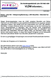 Wegen Sanierungsarbeiten muss die L3451 zwischen Braunfels und SolmsOberndorf vom 25.07.2022 bis voraussichtlich 02.09.2022 für den regulären Verkehr vollgesperrt werden. Das betrifft auch den Linienverkehr der Linie 185 (WetzlarBraunfels). In diesem Zeitraum fahren die Linienbusse, wie bei der Anbindung des neuen Gewerbegebiets in Braunfels, über die diesmal nicht ausgewiesene Umleitungsstrecke von Oberndorf Richtung Bonbaden über die „Attenbach“ nach Braunfels. Die Haltestellen Oberndorf „Blauer Berg“ und Braunfels „Deiker Weg“ können nicht bedient werden, in dieser Zeit müssen Fahrgäste auf die Haltestellen Oberndorf „Braunfelser Straße“ bzw. Braunfels „Busbahnhof“ ausweichen.