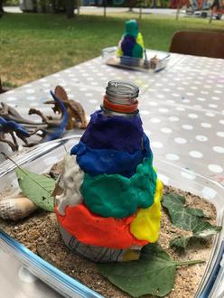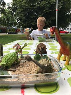Eine kleine Glasform sollte die Vulkanlandschaft werden. Hierfür gestalteten die Kinder diese mit Sand, Steinen, Muscheln und Stöcken. Richtig echt wirkten die Landschaften aber erst, als die Teilnehmenden ihre mitgebrachten Spielfiguren platzierten. Als nächstes wurden die Vulkane gestaltet. So entstanden diese aus Plastikflaschen, etwas Zeitung und ganz viel Knete. Hier waren der Phantasie keine Grenzen gesetzt. Um den Vulkan letztlich zum Ausbruch zu bringen, wurden Backpulver, Essig, Lebensmittelfarbe und eine Geheimzutat benötigt. Während des Experiments wurden die Augen der Kinder groß, „mit so einem Vulkanausbruch haben sie nicht gerechnet“, freute sich Nadine Eckert.
