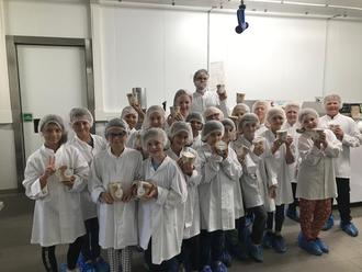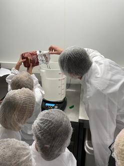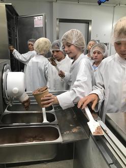 Nun ging es endlich los mit der Eisherstellung. „Hier sieht alles aus wie in einer Küche, nur in groß“, lacht ein Teilnehmer. Große Eismaschinen, Schockfroster, Gefäße und sogar einen Backofen gibt es. „Wenn wir z.B. Eis mit Browniestücken herstellen, backen wir auch die Brownies selbst.“ Für das leckere Schokoladeneis, welches die Kinder heute herstellen, werden verschiedene Zuckersorten, Kakao, Milch und Sahne sorgfältig abgewogen und zusammengemixt. Anschließend kommen die 15 Kilo Eismasse nach und nach in die große Eismaschine. Ein besonderes Highlight für die Kinder, war es ihr Eis selbstständig in Becher abzufüllen und diese mit den entsprechenden Etiketten zu bekleben. „Mir macht das so Spaß, ich arbeite hier später mal“, verkündetet eine Teilnehmerin stolz. „Tatsächlich bilden wir in unserem Unternehmen auch aus“, lachte Elia Rauber.