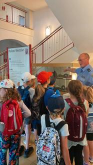 Ein echtes Highlight im Solmser Ferienprogramm war der Besuch bei der Polizei Wetzlar. “Trotz der Vielzahl an Programmpunkten, haben wir immer wieder ganz viele Kinder auf der Warteliste. Beim Besuch der Polizei war es aber diesmal besonders deutlich, wie interessiert die Kinder für die Arbeit der Gesetzeshüter*innen sind“, so Julia Gash von der Kinder- und Jugendförderung.