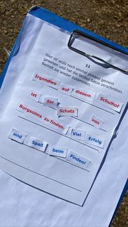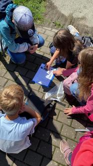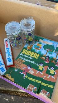 Bereits um das Jugendzentrum herum, gab es die ersten Hinweise zu entdecken, die den Teilnehmenden den Weg vorgaben. Insgesamt neun Hinweise mussten gefunden werden. Dabei entpuppten sich die Hinweise als kleine Rätsel, die gelöst werden mussten, um den weiteren Weg bis zum Schatz zu finden. So haben die Kinder zerschnittene Wörter in Sätze zusammengefügt, ein Puzzle zusammengesetzt und Rechenaufgaben gelöst. Der Weg begann am Jugendzentrum, führte über den Mühlweg bis zum Bachtrompeter, an den Gärten vorbei zum Gemeindehaus bis es schließlich in Richtung Gesamtschule ging. Auf dem Schulhof fanden sie den letzten Hinweis und waren dem Schatz schon ganz nah. Nach einer kurzen Suche unter dem Klettergerüst und hinter den Bäumen, fanden sie die lila Schatzkiste in einer Hecke. Belohnt wurden die Detektive mit Schokolade und Murmeln. Natürlich durfte auch eine kleine Urkunde nicht fehlen. „Wir sind heute so viel gelaufen, dabei war der Schatz doch eigentlich von Anfang an ganz in unserer Nähe“, sagte eine Teilnehmerin. „Da wollte es euch die Schatzmeisterin wohl nicht so einfach machen“, lachte Nadine Eckert.