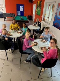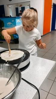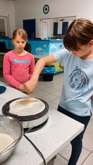 Los ging es mit der Herstellung des Eis. Weil die Eismasse im Vorhinein eingekocht und anschließend zwölf Stunden kühlgestellt werden musste, war diese bereits vorbereitet. Julia Gash erklärte den kleinen Eislehrlingen aber ganz genau, was sich für Zutaten in der Eismasse befinden. „Ich habe Sahne, Milch, Zucker und Ei zusammengerührt. Ganz wichtig war aber die Hauptzutat: frische Bourbon Vanille - nur so wird das Eis zu einem echten Vanille-Eis!“ Die Eismasse wurde von den Kindern in die Eismaschine gegeben, wo sie für ca. 40 Minuten verbleiben musste. In der Zwischenzeit wurden noch Schokoladenraspeln hinzugegeben. „Und so wird aus einem Vanille-Eis, ein Stracciatella-Eis“, erklärt Gash. In der Wartezeit haben die Kinder gemeinsam mit Felix Drebes den Teig für die Crepes hergestellt. Auch hierfür wurden Mehl, Milch und Eier benötigt. Nun konnten sich die Teilnehmenden an das Crepes-Eis wagen. „Ich habe das schon mal auf dem Weihnachtsmarkt gesehen“, berichtet ein Junge. „Das ist auch gar nicht so schwer. Wir nehmen eine Kelle Teig und lassen den Teig auf das Eisen laufen. Im Anschluss nehmt ihr den angefeuchteten Teigverteiler und zieht vorsichtig Kreise, damit sich der Teig auch gleichmäßig verteilt. Wenn die eine Seite etwas vorgebräunt ist, nehmt ihr den Teigwender und dreht den Crepes einmal um“, erklärt Nadine Eckert. Zu den selbstgemachten Crepes kam schließlich noch eine frische Kugel Eis. Um dem Crepes den letzten Schliff zu verleihen, konnte er noch mit vielen Leckereien verziert werden. Dazu zählten, Zuckerperlen, Früchte, Nutella und Kekskrümel. Eishungrig ging an diesem Nachmittag kein Kind nach Hause.