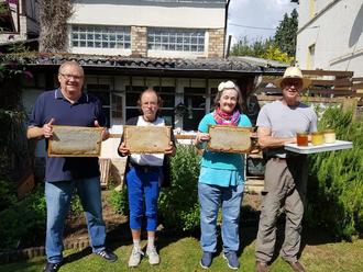 die Gäste präsentieren die reifen Honigwaben, Hans-Helmut Hofmann (rechts) zeigt die Honigsorten