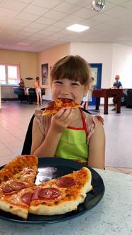 Der gelernte Koch und Italiener besuchte schon das dritte Mal das Jugendzentrum, um den Solmser Ferienkindern die Welt der italienischen Küche näher zu bringen. Gemeinsam stellten sie aus Mehl, Hefe, Salz und Wasser einen Hefeteig her, der zunächst noch etwas gehen musste, bevor er in kleine Kugeln gerollt wurde. Erst danach konnte der Teig ausgerollt und mit einer leckeren, selbstgemachten Tomatensauce bestrichen werden. Alle Kinder konnten selbstständig entscheiden, wie sie ihre Pizza gerne belegen würden. Das Highlight waren anschließend die beiden Pizzaöfen, die Toni extra mitgebracht hatte. „Die Öfen werden bis zu 500 Grad heiß. Dadurch wird der Teig besonders knusprig und die Pizza braucht nur wenige Minuten um fertig zu sein“, erklärte Toni den Kindern. Diese standen begeistert vor den Öfen und warteten, bis ihre Pizza fertig war. „Mhm, die Pizza ist sooo leckert“, schwärmte ein Teilnehmer. Toni überraschte die Kinder zum Schluss sogar noch mit selbstgemachten Brownies zum Nachtisch. Satt und glücklich verabschiedeten die Kinder die fünfte Ferienwoche und starteten ins Wochenende.