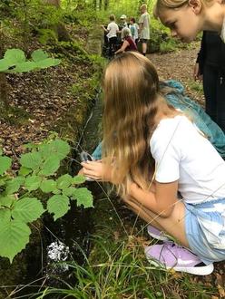 Nach einer Vorstellungsrunde, wurden die Kinder an das erste von vier Themenfeldern herangeführt. Zum Überleben ist der menschliche Körper auf Wasser angewiesen. Aber wo findet man Wasser und kann das dann überhaupt getrunken werden? „Wasser findet sich immer da, wo es hinunter geht. Vielleicht kann auch das ein oder andere Tier beobachtet werden, welches sich auf den Weg zu einer Wasserquelle macht. Denn auch Tiere benötigen Wasser zum überleben“ erklärte Christopher Recchia. Ob das Wasser trinkbar ist, lässt sich leicht mit einer Becherlupe erkennen. Die Ferienkinder machten sich auf den Weg zu einer Wasserstelle und untersuchten das Wasser nach kleinsten Tierchen. Bei trinkbarem Wasser, lassen sich bestimmte Tierchen, wie den Flohkrebs, finden. Neben der Wasserzufuhr, ist aber auch die Nahrung wichtig. „Es gibt in der Natur viel mehr, was wir essen können als wir denken. Überall lassen sich Beeren und Kräuter finden“, so Nicole Jagst-Recchia. Aber natürlich kann auch hier nicht alles gegessen werden. Es gibt durchaus auch giftige Pflanzen und Beeren. Also gingen alle gemeinsam auf Entdeckungstour, um Kräuter zu finden, die für uns Menschen völlig unbedenklich sind. Dabei wurden Schafgarbe und wilde Minze gefunden. „Brennnesseln können auch gegessen werden und sind dabei noch richtig gesund. Wenn alle vorsichtig sind, kann eine Brennnessel sogar gestreichelt werden“, weiß ein Ferienkind.
