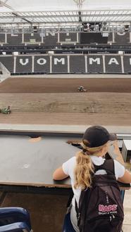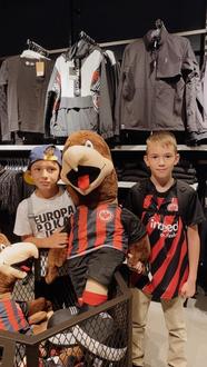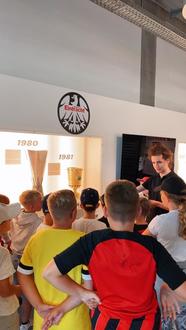 Der Tag begann am Wetzlarer Bahnhof von wo aus es mit dem Zug zum Frankfurter Hauptbahnhof ging. Viele der Teilnehmenden sind schon häufig mit dem Zug gefahren, einige waren sogar schon mal im Stadion, für andere hingegen, war der ganze Tag ein neues Erlebnis. In Frankfurt angekommen, machten sich alle gemeinsam auf den Weg zur S-Bahn, um noch zwei Stationen bis zum Stadion zu fahren. Dort angekommen, trennten die Kinder und Jugendlichen dann nur noch wenige Gehminuten von dem großen Stadion und gleichzeitig Heimat der Eintracht Frankfurt. Mit großen Augen liefen sie auf das Stadion zu und freuten sich direkt im Stadionmuseum von Felix begrüßt zu werden, der ihnen nicht nur die Pokale zeigte, die die Eintracht bereits gewann, sondern auch etwas über die 125-jährige Geschichte des Vereins erzählte.