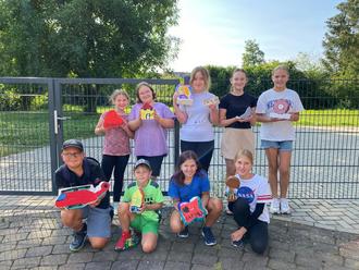 Zehn junge Bildhauer*innen folgten der Einladung und starteten nach einer kurzen Vorstellungsrunde mit ihren Skulpturen. „Ytong ist ein ganz weicher Wandbaustein. Mit Säge, Hammer und Pfeilen kann man aus diesem Stein ganz schnell tolle Skulpturen bauen.“, erklärt Sabine Schäfer den Teilnehmenden. „Da das Material allerdings auch sehr staubig und brüchig ist, müssen wir unbedingt Schutzbrillen während der Arbeiten tragen. Auch Handschuhe schützen euch gut.“, so Schäfer weiter bevor es los geht. Draußen fanden die Kinder schon Tische mit den Steinen und viele mögliche Arbeitsmaterialien vor. Es entstanden Herzen, Pilze und Häuser. Besonders kreativ wurden ein Hubschrauber und ein Donut umgesetzt. Den Feinschliff bekamen die Kunstwerke dann noch mit Acrylfarbe, wo noch weitere Kunstwerke entstanden. Die Ytong Steine können jetzt Zuhause als Deko im Garten, auf der Terrasse oder drinnen vor dem Fenster einen Platz finden.