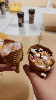 Zu Beginn erzählten die beiden von ihrem Vorhaben Eiswaffeln mal ganz anders zu befüllen als es üblich ist. „Tatsächlich haben wir das auch noch nie gemacht und wir schauen gemeinsam was am Ende dabei herauskommt“, lacht Gash. Also begann das Experiment und es wurde zunächst in zwei Gruppen Rührteig zum befüllen hergestellt. Einige Schokoraspeln dürfen da natürlich nicht fehlen. Die dritte Gruppe hatte dann die Aufgabe die fertigen Eiswaffeln vorsichtig mit dem Teig zu befüllen. Dabei musste darauf geachtet werden, dass sie nicht zu voll befüllt werden und die Waffel nicht schon aufplatzt. „Und wie wird das jetzt gebacken?“, fragt sich ein Teilnehmer. „Wir haben hier Kastenformen zum Backen, die wir mit Alufolie umwickelt haben. Hier können wir die Eiswaffeln jetzt reinstellen ohne das sie umfallen.“, erklärt Eckert. Und so wurden die Formen mit den Eiswaffeln in den Ofen gestellt und der Kuchen konnte hochbacken. Nachdem sie etwas abgekühlt waren, konnten die Kinder und Jugendlichen ihre Kuchen in der Eiswaffel noch mit Zuckerguss und Streuseln verzieren. Es dauerte nicht lange, bis die Eiswaffel gegessen wurden. „Die sind ja richtig lecker“, stellt eine Teilnehmerin fest. Es sind so viele kleine Kuchen in Eiswaffeln geworden, dass sich sogar alle noch etwas mit nach Hause nehmen konnte und somit eine schöne Erinnerung an das Ferienprogramm haben, bevor die Schule wieder anfängt.