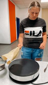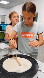 Los ging es mit der Herstellung des Eis. Weil die Eismasse im Vorhinein eingekocht und anschließend zwölf Stunden kühlgestellt werden musste, war diese bereits vorbereitet. Julia Gash erklärte den kleinen Eislehrlingen aber ganz genau, was sich für Zutaten in der Eismasse befinden. „Ich habe Sahne, Milch, Zucker und Ei zusammengerührt. Ganz wichtig war aber die Hauptzutat: frische Bourbon Vanille – nur so wird das Eis zu einem echten Vanille-Eis!“ Die Eismasse wurde von den Kindern in die Eismaschine gegeben, wo sie für ca. 40 Minuten verbleiben musste. In der Zwischenzeit wurden noch Schokoladenraspeln hinzugegeben. „Und so wird aus einem Vanille-Eis, ein Stracciatella-Eis“, erklärt Gash. In der Wartezeit haben die Kinder gemeinsam mit Felix Drebes den Teig für die Crepes hergestellt. Auch hierfür wurden Mehl, Milch und Eier benötigt. Nun konnten sich die Teilnehmenden an das Crepes-Eis wagen. „Ich habe das schon mal auf dem Weihnachtsmarkt gesehen“, berichtet ein Junge. „Das ist auch gar nicht so schwer. Wir nehmen eine Kelle Teig und lassen den Teig auf das Eisen laufen. Im Anschluss nehmt ihr den angefeuchteten Teigverteiler und zieht vorsichtig kreise, damit sich der Teig auch gleichmäßig verteilt. Wenn die eine Seite etwas vorgebräunt ist, nehmt ihr den Teigwender und dreht den Crepes einmal um“, erklärt Nadine Eckert. Zu den selbstgemachten Crepes kam schließlich noch eine frische Kugel Eis. Um dem Crepes den letzten Schliff zu verleihen, konnte er noch mit vielen Leckereien verziert werden. Dazu zählten, Zuckerperlen, Früchte, Nutella und Kekskrümel. Eishungrig ging an diesem Nachmittag kein Kind nach Hause.