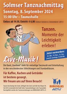 Der nächste Tanznachmittag mit der Band „Querbeet“ findet am 08.09.2024 in der Taunushalle statt.