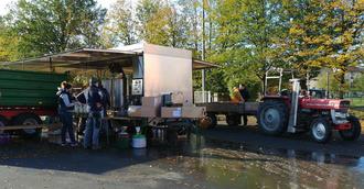 Stilgerecht: Anlieferung der Äpfel mit einem alten Traktor