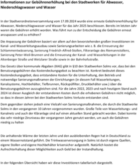 In der Stadtverordnetenversammlung vom 17.09.2024 wurde eine erneute Gebührenerhöhung für Abwasser, Niederschlagswasser und Wasser für das Jahr 2025 beschlossen. Bereits im letzten Jahr waren die Gebühren erhöht worden. Was führt nun zu der Entscheidung die Gebühren erneut anzupassen und zu erhöhen?