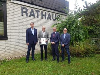 Zu den Gratulanten im Solmser Rathaus gehörten neben Bürgermeister Frank Inderthal, dem Ersten Stadtrat Jörg Leidecker und dem Stadtverordnetenvorsteher Dieter Hagner, beide selbst auch ehrenamtlich als Ortsgerichtsvorsteher tätig, auch die Ortsgerichtsschöffen Andreas Hofmann, Erwin Müller, Frank Wagner und Lars Wilhelm.