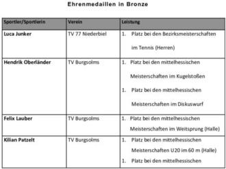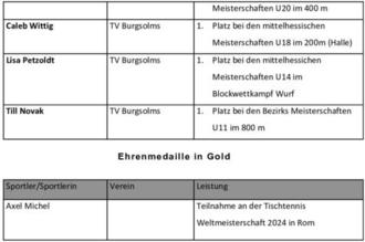 Seinen besonderen Dank richtete er jedoch nicht nur an die Sportlerinnen und Sportler, sondern auch an die Trainerinnen und Trainer, Eltern sowie den zahlreichen Ehrenamtlichen in den Vereinen. Nur mit der Unterstützung dieser Personen kann ein Sportler seine Spitzenleistungen abrufen. Für die sportlichen Leistungen erhielten die Sportler, neben einer Urkunde eine Medaille, die Erster Stadtrat Jörg Leidecker im Namen des Magistrates der Stadt Solms überreichte.