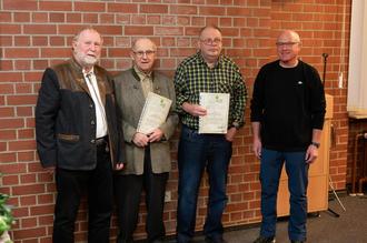 (von rechts nach links: 1. Vorsitzender Helmut Müller, Heinz Hartert und Wolfgang Herold (beide 50jähriges Jubiläum) und Werner Gerlach (Stellv. Landesvorsitzender & 1. Vorsitzender Kreisverband Lahn-Dill vom Landesverband Hessen für Obstbau, Garten und Landschaftspflege e.V.