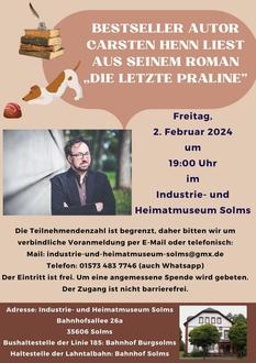 lädt das Team vom Museum zu einer kurzweiligen Autorenlesung mit dem bekannten Autor Carsten Henn („Der Buchspazierer“) ein: