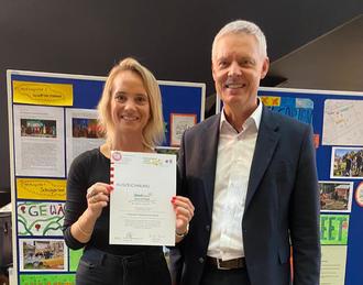Kulturstaatssekretär Markus Lösel übergibt das Zertifikat an Hannah Hagner von der IGS