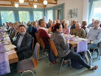 Zur Feier waren viele Delegationen anderer Frauenhilfen gekommen. Iris Unger, stellvertretende Vorsitzende des Kreisverbandes überbrachte Glückwünsche. Simone Pfitzner ehemalige Referentin für Frauenarbeit und Pfarrer Müller-Eidam würdigten die Bedeutung der Frauenhilfe. Auch unser ältestes Mitglied Irmgard Hagner war in unseren Reihen. Der Gemischte Chor umrahmte mit schönen Liedern die Feier. Mit einer Power-Point-Präsentation mit Bildern der verschiedenen Aktivitäten der Frauenhilfe und dem gemeinsamen Lied ‚“Großer Gott wir loben dich“ endete das 90-jährige Jubiläum.
