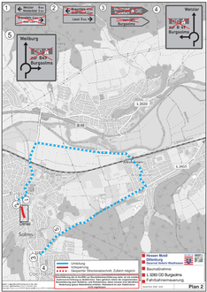 Die Ausführung ist für den Zeitraum der Hessischen Herbstferien (14.10. bis 25.10.2024) vorgesehen und die Maßnahme wird unter Vollsperrung mit Ausweisung einer Umleitungsstrecke über Solms-Albshausen via K 828 und L 3451 durchgeführt.