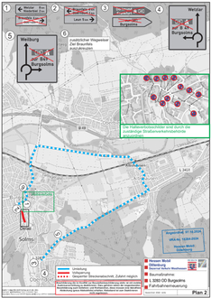 Wegen Fahrbahnerneuerungsarbeiten vom 16.10.2024 bis 26.10.2024 wird die Ortsdurchfahrt Burgsolms (Krautgärtenstraße zwischen Gutleutstraße und Burgsolmser Straße) in beiden Richtungen gesperrt. Die Umleitung erfolgt über Oberndorf, Burgsolms und Albshausen sowie umgekehrt (siehe nachfolgender Umleitungsplan).