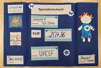 Der Schülerinnen und Schüler der sechsten Jahrgangsstufe hatten vorab den Wunsch, UNICEF mit einer Spende zu unterstützen. Bei der Sammlung konnte am Ende eine Spende von über 200 Euro durch die Klasse 6-3 unter der Leitung von Frau Bechthold-Kern, stellvertretend für den ganzen Jahrgang, übergeben werden.