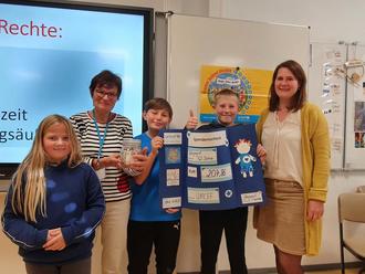 Spendenübergabe: v.l. Paula, Frau Zielinski, Silas, Jonah und Frau Bechthold-Kern Unterricht: Frau Zielinski und die Klasse 6-3