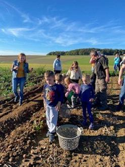 Als Überraschung dürfen die Kinder Kartoffeln selbst auflesen. Gemeinsam mit den Eltern und Kleingeschwistern durften alle mithelfen und die Körbe voll machen.