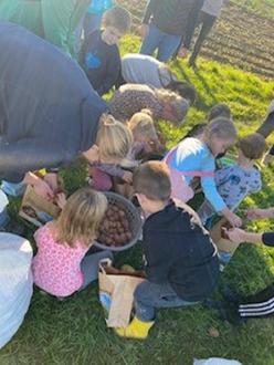 Yannik spendierte jedem Kind eine volle Papiertüte mit 2,5kg selbst geerntete Kartoffeln. Davor gab es schon 20 kg Kartoffeln für unser jährliches Apfelfest im September!