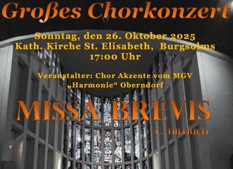 Neben der Missa Brevis von C. Hilfrich können Sie vielstimmige geistliche Chormusik sowie ausgewählte Gitarren- und Orgelvorträge erleben. Der Projektchor der Akzente Oberndorf, der Kirchenchor St. Marien aus Limburg, das Ensemble Chanterelle und die Instrumentalsolisten freuen sich auf Sie!