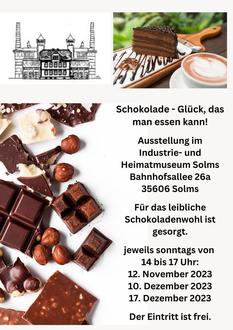 Der Ausstellungsumfang umfasst alles, was Sie über Schokolade und Kakao wissen möchten. Bewundern Sie die kreativ zusammengestellte Ausstellung und die wunderschön dekorierten Vitrinen. Während Ihres Besuchs haben Sie die Möglichkeit am 12. November, eine Kostprobe des vielfältigen Sortiments des Weltladens Solms zu genießen. Vielleicht finden Sie bereits das perfekte Weihnachtsgeschenk!