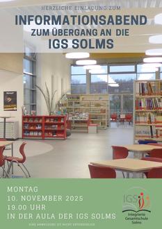 Herzliche Einladung, an alle Eltern der Viertklässlerinnen und Viertklässler, zum Informationsabend an der IGS Solms am 10.11.2025 um 19.00 Uhr in der Aula.
