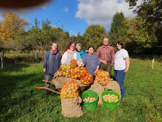 Auf dem Obstgrundstück des HuK-Vorsitzenden Hans-Helmut Hofmann im Grundbachtal ernteten die fleißigen Helfer. Aus den verschiedenen Apfelsorten wie Gacks, Goldrenette von Blenheim und Boiken wurde für den Eigenbedarf des Teilhabezentrums nach der Ernte in Marthas Mosterei Apfelsaft gepresst und abgepackt. Auch Walnüsse wurden gesammelt. Nach der Ernte querte noch ein großer Flug Kraniche die herbstliche Szenerie.
