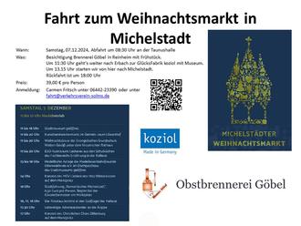 Das erste Ziel ist die Brennerei Göbel in Rheinheim zur Besichtigung und einem Frühstück. Danach geht es zur GlücksFabrik koziol in Erbach und von dort dann zum Weihnachtsmarkt in Michelstadt.