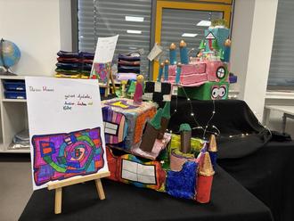 Gewerkelt haben die Viertklässler hauptsächlich mit ihren Klassenlehrerinnen, Sabrina Cekay, Stefanie Schär-Brett, sowie den Kunstlehrerinnen Sylvia Peklo-Kuhlmann und Eva Lukas. Die vielen Informationen, die sie heute über den Maler Hundertwasser vortragen, haben sie von den Kunstlehrerinnen erhalten. Dass zumindest eine von ihnen bei einzelnen „Bauplanungen“ überzeugt werden musste, verraten Ben und Noah: „Wir haben gesagt, dass wir noch Treppen machen wollen, Frau Lukas war davon nicht begeistert“, erzählt Ben. Noah ergänzt: „Dann haben wir schwer diskutiert, bis sie aufgab“.