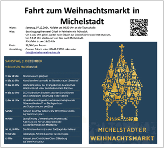 Das erste Ziel ist die Brennerei Göbel in Rheinheim zur Besichtigung und einem Frühstück. Danach geht es zur GlücksFabrik koziol in Erbach und von dort dann zum Weihnachtsmarkt in Michelstadt.