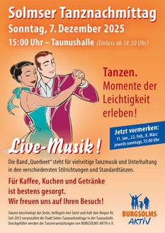 Veranstalter der Solmser Tanznachmittage ist die Stadt Solms, durchgeführt werden sie von Burgsolms Aktiv e. V.